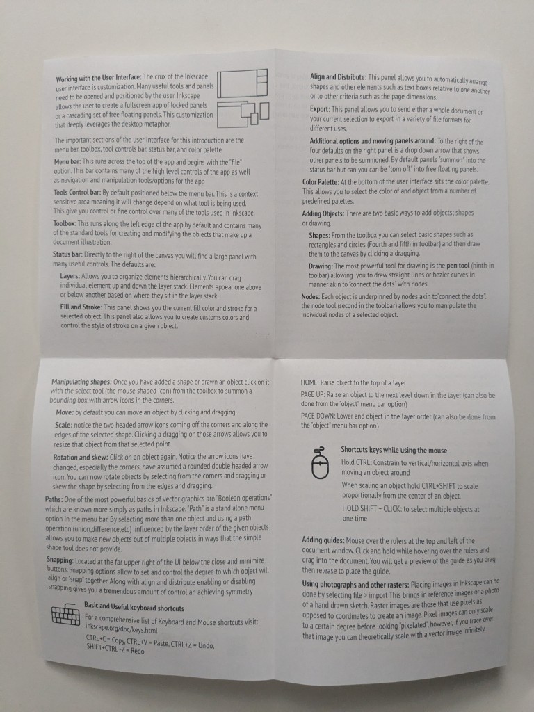 5. Flip the zine over to see the interior pages with the upper left page displaying the instructions "Where to download Inkscape: inkscape.org"
